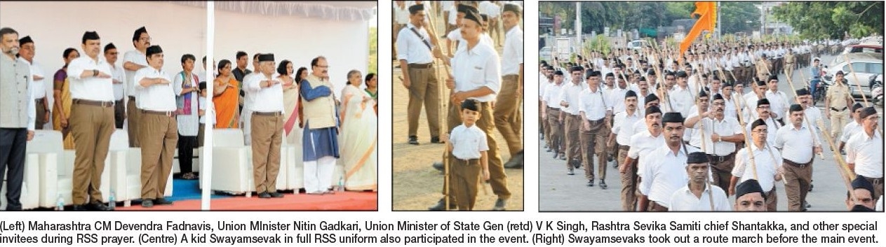 Towards the end of his speech, Dr Bhagwat appealed to the people not to depend solely upon the Government to address social problems but to take upon themselves the duty of aiding the rise of the nation. He also appealed to the media to shun commercial attitude of churning out spicy and sensational content, and contribute to creating a constructive atmosphere. Devendra Fadnavis, Chief Minister of Maharashtra; Nitin Gadkari, Union Minister for MSMEs; Gen (retd) V K Singh, Union Minister of State for MSMEs; Shantakka, Pramukh Sanchalika of Rashtra Sevika Samiti; Baba Kalyani of Bharat Forge Limited; Nanda Jichkar, Mayor; Chandrashekhar Bawankule, Guardian Minister of Nagpur district; and several dignitaries were present prominently on the occasion.