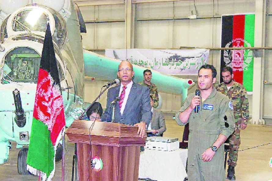 Afghanistan’s acting Defence Minister Asadullah Khalid thanks Indian Ambassador Vinay Kumar for handing over a second pair of Mi-24V helicopters to war-torn Afghanistan, at the military airport in Kabul on Tuesday. (PTI)