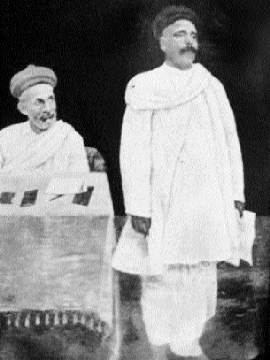 Lokmanya Tilak speaking at a public function as ‘Brahmarshi’ Annasaheb Patwardhan (sitting) looks on.