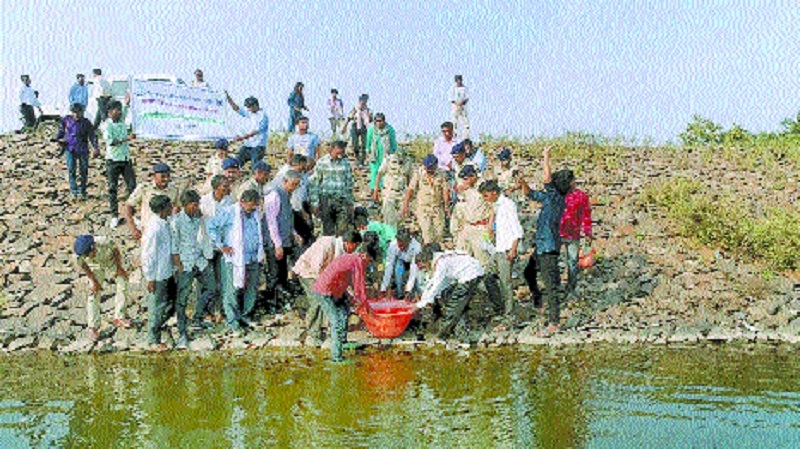 Mahashir fish fingerlings being released in a reservoir in Hira Bambai in Dharni tehsil of Amaravati district.