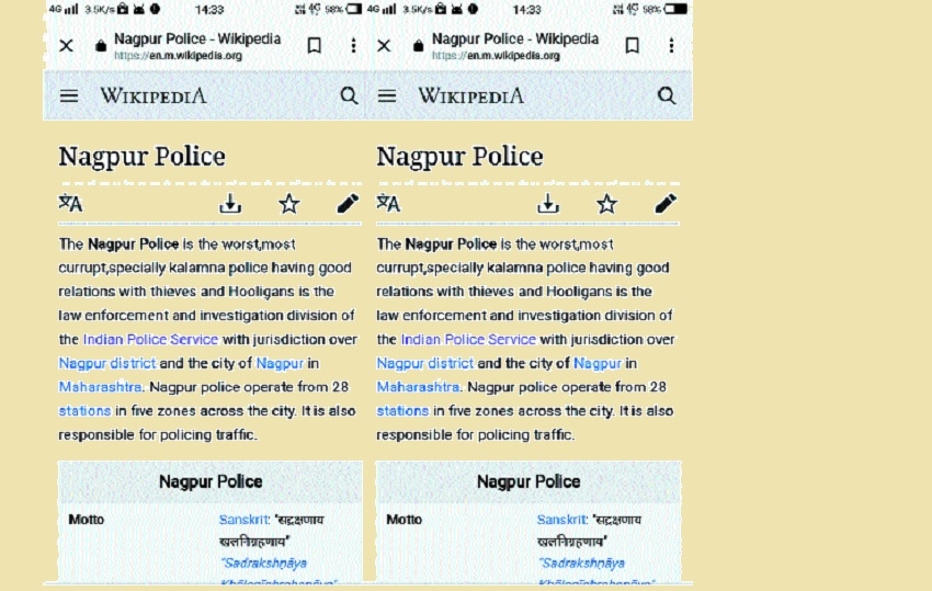 THE Nagpur Police got the taste of what cyber miscreants are capable of when they discovered that their introduction on Wikipedia had been tampered with. Interestingly, the cops were not aware of their image-maligning some miscreants had done on the Wikipedia page. It was only when ‘The Hitavada’ brought the mischief to their notice that the Cyber Cell got into a damage control mode and re-edited the Wiki information. For a few days the Wikipedia described Nagpur Police as “the worst, most corrupt, specially Kalamna police having good relations with thieves and hooligans in the law enforcement and investigation division of Indian Police Service with jurisdiction over Nagpur District.”