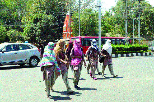As scorching heat prevails, school girls returning home by covering their head with dupatta in State capital on Friday.