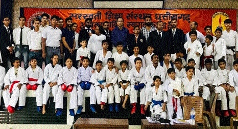 Winners of the Chhattisgarh Sub-Junior Karate Championship posing along with officials.