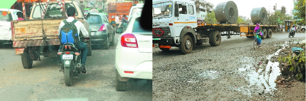 Chaos on Road: Chaotic traffic is order of the day at Pardi as ongoing construction frenzy that slowed down creating problems aplenty for citizens. (Right) A trailer wounds its way through narrow turning radius at Pardi Square posing dangers to adjoining cyclist and also to two-wheeler owing to poor road surface. (Pics by Satish Raut)