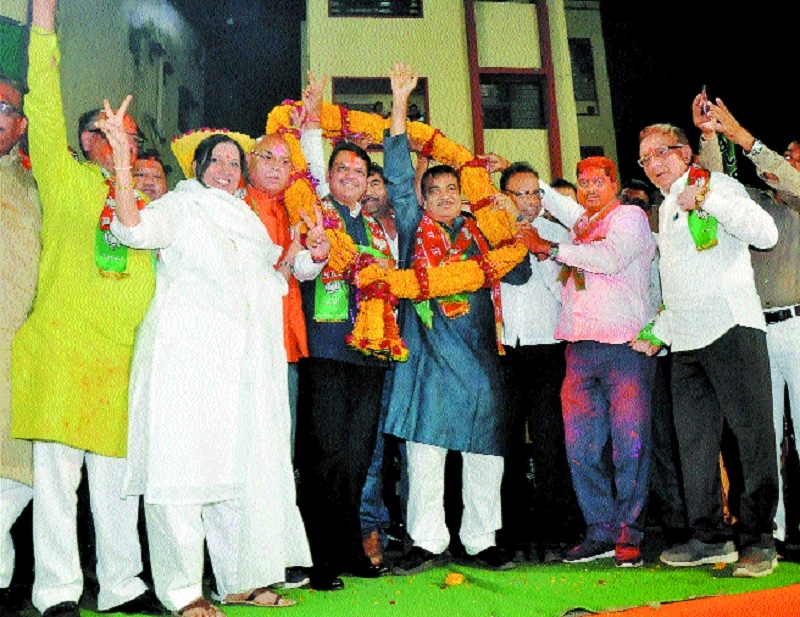 State President of Congress party Ashok Chavan also has bitten the dust. BJP and its allies have defeated Congress-Nationalist Congress Party combine. BJP has clinched victory in Madha constituency too, to which was associated the prestige of NCP chief Sharad Pawar.” Fadnavis congratulated Gadkari and said that though the Opposition tried to play caste cards in the election, voters did not respond to them. Gadkari has been helping the people beyond caste and creed. In Nagpur’s history no candidate has ever secured more than 57 per cent votes, but Gadkari has achieved the feat. Party will remain grateful to voters, he said. Attributing the credit of BJP’s victory in Maharashtra to Devendra Fadnavis, Gadkari said, “It was the leadership of Fadnavis that made a difference. His contribution to the victory of BJP in Maharashtra is very big. We fought election considering it as a festival of democracy.