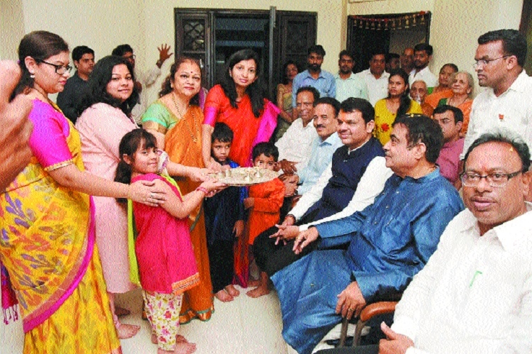 Gadkari’s wife Kanchan, daughter Ketaki, daughters-in-law Rutuja and Madhura, and grand-daughter giving him traditional welcome by performing his ‘Aukshan’.