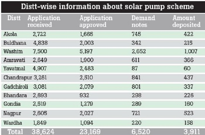 MSEDCL, in a press note issued here, has stated that the work of installation of solar pumps has been undertaken on priority basis. Chief Minister devendra Fadnavis, Energy Minister Chandrashekhar Bawankule and CMD of MSEDCL sanjeev Kumar are keen to popularise the scheme in an efort to solve a major problem of farmers. Out of 38,624 applications received, 23,169 were approved. MSEDCL issued demand notes to 6,520 applicant farmers.