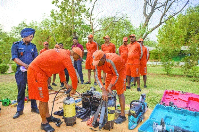 Personnel of 6th NDRF check emergency and rescue material at a NDRF camp in Naroda in Gujarat on Tuesday. (AFP)