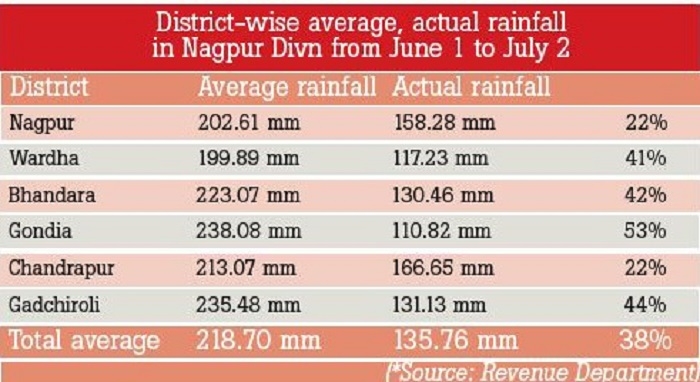 Though Vidarbha in general has received good downpour in the past few days, Nagpur Division in particular is still 38 per cent deficient in rainfall as compared to average for the period June 1 to July 2. As per the official data, of a total 64 tehsils in Nagpur Division, as many as 61 tehsils are deficient in rainfall. Only three tehsils in the division -- Umred (15 per cent), Korpana (45 per cent), and Jiwati (24 per cent) -- have received surplus rainfall. Rest 61 tehsils are deficient in rainfall in varying degrees. Among six districts namely Nagpur, Wardha, Bhandara, Gondia, Chandrapur, and Gadchiroli, Gondia is the worst-hit by deficiency. Gondia is still 53 per cent deficient in rainfall. Also, top three deficient tehsils in Nagpur Division are in Gondia district. These include Deori (72 per cent deficient), Sadak Arjuni (68 per cent deficient), and Salekasa (64 per cent deficient). Among other districts, Nagpur and Chandrapur are better off with only 22 per cent deficiency in receiving rainfall. In Nagpur district, Kalmeshwar is 63 per cent deficient, followed by Parseoni 54 per cent deficient in rainfall as compared to average. Umred has received 15 per cent surplus rainfall. Nagpur Rural has received 93 per cent of the average rainfall and is merely seven per cent deficient. It is followed closely by Hingna and Kuhi tehsils receiving 92 per cent and 93 per cent rainfall received so far. Overall, Nagpur district has received 158.28 mm rainfall as against average of 202.61 mm for the period between June 1 and July 2. In Nagpur city also, waterlogging took place in several areas due to shallows despite construction of tar road. As had happened a couple of years ago, water accumulation in Reshimbagh ground made it look like a new lake created by the civic authorities.