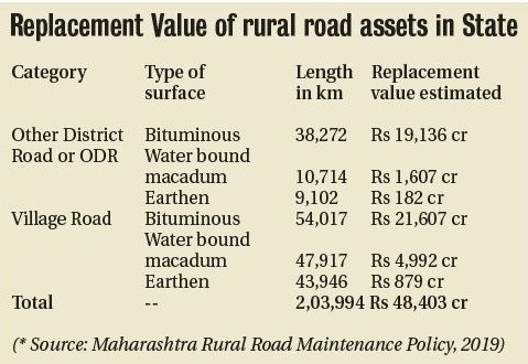 These are further sub-divided into three sub-categories namely Bituminous Surface, Water Bound Macadum Surface, and Earthen Surface. Rural roads ‘replacement value’ pegged at Rs 48,403 crore Probably for the first time, an estimation of ‘replacement value’ of rural road network under the jurisdiction of Rural Development Department has been done. The policy document running into several pages mentions about this ‘replacement value’, which has been made treating rural roads as a ‘huge asset base’ and considering that any ‘inadequacy in maintenance, funding, and implementation on ground’ results in erosion of this asset base.