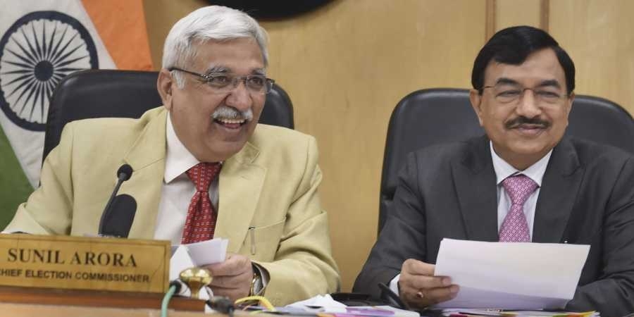 Chief Election Commissioner Sunil Arora with Election Commissioner Sunil Chandra (R) during a press conference regarding Maharashtra and Haryana Assembly Elections, at Election Commission in New Delhi Saturday. (PTI)