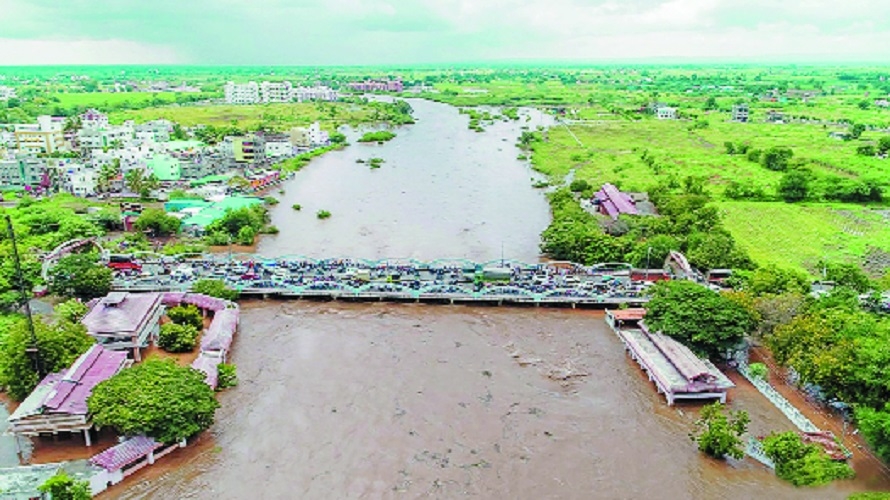 A view of the flooded Karha River in Baramati, Maharashtra on Thursday. (PTI)