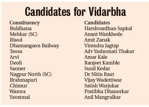 Congress released its first list of 51 candidates for the Maharashtra Assembly elections, on Sunday. From Vidarbha, prominent names that figured in the list included Sunil Kedar, sitting MLA from Saoner; Vijay Wadettiwar, Leader of Opposition in State Assembly from Brahmapuri; Dr Nitin Raut from North Nagpur (SC). Suresh Dhanorkar, the lone MP from Congress in Maharashtra succeeded in getting ticket for his wife Pratibha. She will be contesting from Warora constituency.