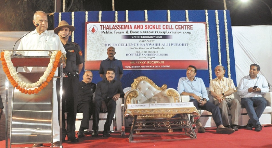 Appealing people to come forward and join hands of Dr Vinky Rughwani who is rendering selfless services to thalassemia and sickle cell patients, Tamil Nadu Governor Banwarilal Purohit said, “We earned our name by eradicating polio. In the same way we should launch drive for the eradication of thalessemia and sickle cell.” Purohit was speaking during the inauguration of free HLA matching camp, organised by Dr Vinky Rughwani Centre for Thalessemia and Sickle Cell at Jaripatka on Thursday.
