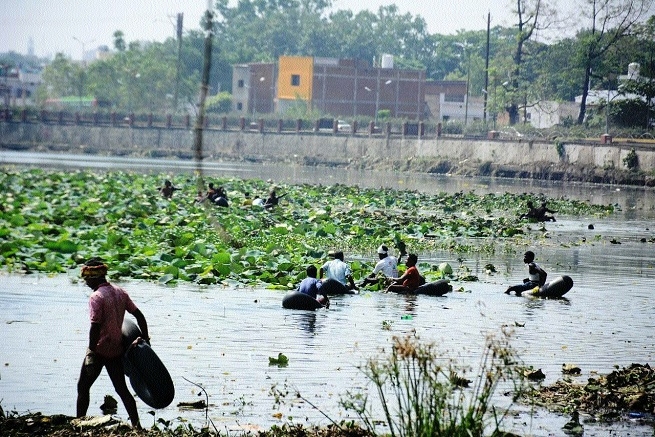 Fishermen cleaning the waterweeds and watercress from Budha Talab.