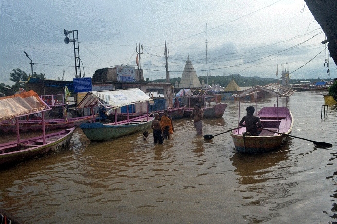 Temples and shops in Gwarighat submerged as Narmada swells following continues discharge of water from Bargi Dam.