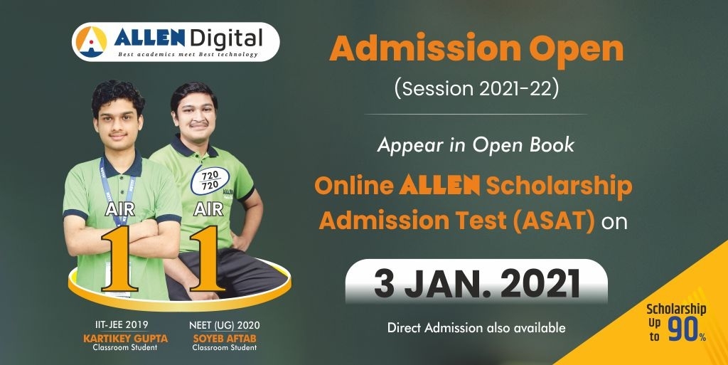 Allen has always been enthusiastic and motivated to encourage talent and offers the best possibilities and excellent mentorship to students. The institute encourages talent through the ALLEN Scholarship Admission Test (A-SAT), which will be conducted on January 17, 2021. Through ASAT, students can get up to 90 per cent scholarship in fees while they take admission in the courses of the academic session 2021-2022. Students of classes 7th to 11th can participate in the A-SAT exam for admission in ALLEN Career Institute, Nagpur.
