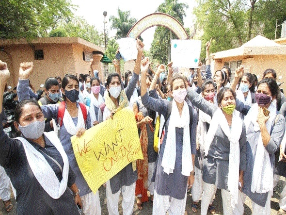 Demanding online exam, large number of girl students from Government Geetanjali College staged protest on Tuesday. Students said that a professor has been tested COVID-19 positive after which they are scared of visiting the campus. There were around 100 students from UG and PG programme raising slogan against management. They kept on sitting at main gate of college for two hours and displayed board for the demand.