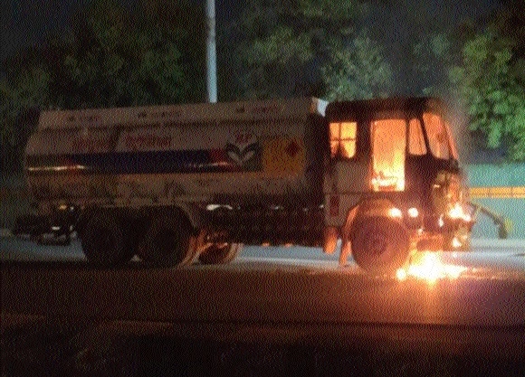 Meanwhile, the tanker's engine caught fire when it reached near Nehru Nagar Toll Plaza. Immediately after reaching the spot the traffic police informed the police control room and traffic on both sides of the route was stopped and controlled. On the information received from the police control room, fire fighting and emergency services fire engines located in the police control room left for the fire site. The fire personnel extinguished the fire in the diesel tanker and secured the area around the toll plaza. This averted a major mishap in Durg district on Thursday. Fire fighters Mahendra Kumar Chandel, Nagesh Markande, Parag Bhosale, Hiraman played a commendable role in controlling this arson incident.