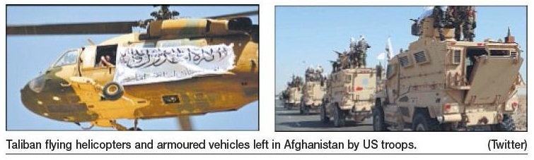 A BUNCH of helicopters was seen flying over southern Afghanistan while jubilant Taliban members below stood aboard captured US military hardware as the Islamist group paraded them with pride. The United States forces left Afghanistan on Tuesday morning, marking the end of a chaotic and messy exit from America’s longest war. In the second-biggest city of Kandahar, a long line of green armoured vehicles was driven in single file on Wednesday, with the group’s flags attached to it, ‘Dawn’ reported cities agencies. Local media reports said multiple trucks of US and Nato forces were paraded at Ayno Maina town, on the outskirts of the city.