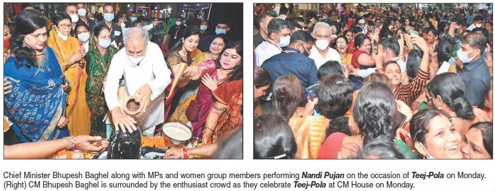 They had requested the Chief Minister to exempt the loan taken in the past, so that they can be able to get new the loan and start economic activities afresh. On the request, the budget of the loan amount given to women groups increased by five times. Meanwhile, the residence of Chief Minister Bhupesh Baghel turned maternal house for women who turned up to celebrate Teej-Pola and wish the chief minster on the occasion. Teej-Pola was celebrated with pomp and show at the Chief Minister’s residence. The rainbow colors of Chhattisgarhi culture were created in the Chief Minister’s residence. On the invitation of the Chief Minister, a large number of women in traditional attire participated in the event with great enthusiasm. Amidst chanting of mantras, Chief Minister Bhupesh Baghel along with his wife Mukteshwari Baghel and family members prayed for the state's happiness and prosperity by offering prayers to Lord Shiva, Nandi Baila and Chukian-Pora.