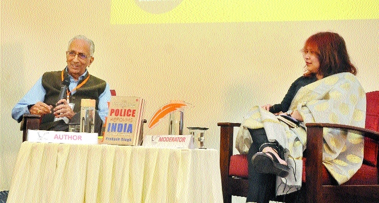 Ex DGP Prakash Singh making a point during a conversation with Adv Anita Sarkar organised by VLF, on Saturday. (Pic: Anil Futane)