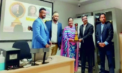 Director of Mascot Honda Indira Raje Bhonsale received the award at the hands of Subhash Chopra, Western Regional Head - Honda Motorcycle & Scooter India Pvt. Ltd, in presence of Harshad Pujari, Zonal Manager; and Amit Patil, Area Manager. Indira Raje Bhonsale congratulated all the team members of the Mascot Honda two--wheeler showroom.