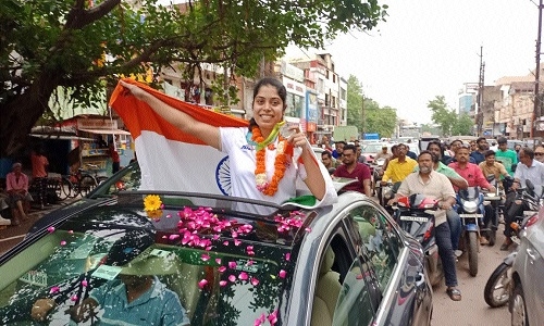 International badminton player Akarshi Kashyap, who brought laurels to State, was greeted by huge crowd when she reached her hometown Durg on Wednesday.