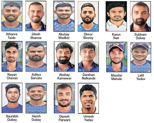 Professionals Dhruv Shorey and Karun Nair will be making their debuts for Vidarbha. The team Atharva Taide (Captain), Jitesh Sharma (Vice-Captain), Akshay Wadkar (WK), Dhruv Shorey, Karun Nair, Subham Dubey, Nayan Chavan, Aditya Sarvate, Akshay Karnewar, Darshan Nalkande, Mandar Mahale, Lalit Yadav, Saurabh Dubey, Harsh Dubey, Dipesh Parwani.