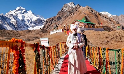 PRIME Minister Narendra Modi arrived here on Thursday, and began his daylong visit to the border State with a darshan of the Adi Kailash peak, an abode of Lord Shiva, and a puja at Parvati Kund. Wearing a traditional tribal outfit complete with a turban and ‘ranga’ (upper body garment), Modi performed an ‘aarti’ and blew the conch shell at the Shiva-Parvati temple situated along the banks of Parvati Kund in Jolingkong. He was guided by local priests Virendra Kutiyal and Gopal Singh. He also sat in meditation briefly with folded hands in front of the Adi Kailash peak, also in Jolingkong.