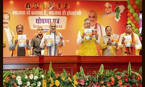 The BJP Manifesto promises Chhattisgarh Institute of Medical Sciences (CIMS) on the lines of AIIMS in every division of Chhattisgarh and to create Chhattisgarh Institute of Technology (CIT) in every Lok Sabha constituency on the lines of IIT. The BJP manifesto says that the BJP government will organise Invest Chhattisgarh on the lines of Invest India and will invite investment from domestic and foreign companies by holding an annual global-level conference. Under Sarkar Tunhar Dwar scheme in the state, the BJP government will ensure effective home delivery of public services by recruiting 1.5 lakh unemployed people at Gram Panchayat and Ward level. By starting a 1,000 km long ‘Shakti Peeth Project’ in the state, the BJP government will work to develop and connect the five Shakti Peeths of Chhattisgarh on the lines of the Char Dham Project of Uttarakhand. The manifesto also promises to take the people of the state to Ayodhya to have darshan of Shri Ram Lalla. Amit Shah assured that once the BJP assumes power in Chhattisgarh, five years of development will ensue. The BJP State President Arun Sao, former Chief Minister Dr Raman Singh, BJP Chhattisgarh In-charge Om Mathur, Manifesto Committee Convenor Vijay Baghel, Co Convenor RamVichar Netam, Amar Agrawal and other senior leaders.