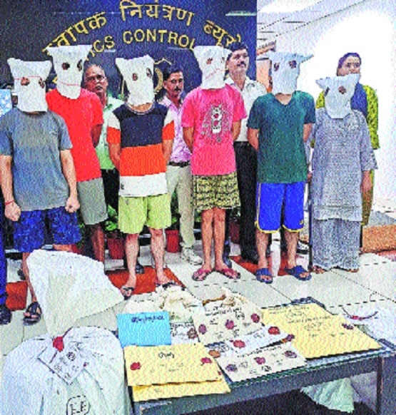 NCB officials with people arrested after the busting of drugs trafficking network operating on the dark web on Tuesday. (PTI)