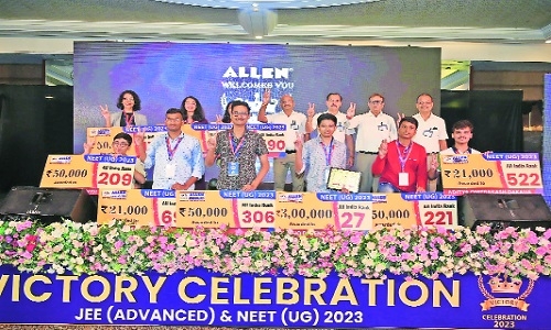 The victory celebration of ALLEN Career Institute Nagpur was organised at Hotel Centre Point, Ramdaspeth on Sunday. ALLEN students who excelled in JEE-Advanced-2023 and NEET UG-2023 examinations were encouraged by awarding medals, mementoes and cash prizes. Allen Career Institute Pvt Ltd Vice President Pankaj Agarwal, Vijay Soni, Sanjay Gaur, Allen Nagpur Centre Head Ashutosh Hisaria and all the faculty and parents were present in the programme.