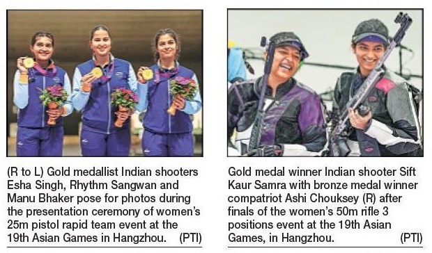 Manu, Esha and Rhythm totalled 1759 to finish on top of the podium inWomen’s 25m Pistol Team