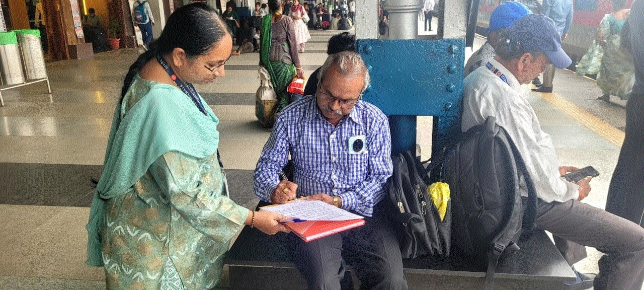 Railway employee creating awareness amongst passengers for cleanliness at Jabalpur Railway Station.