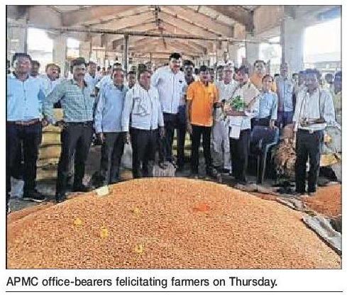 Director of APMCAtul Senad felicitated Goverdhan Wanjari, the first farmer to sell soyabean in the market. President of the committee Sarang Wankhede; Secretary Swapnil Vairagade; Vice President Rameshwar Hirudkaralso felicitated theother farmers. Alargenumberofbrokersand farmers were also present. In the meanwhile, Ajay Parmar, Head of Maharashtra Chapter of Soybean Processors AssociationofIndia (SOPA),said theMSP forsoyabean for thecurrent season is Rs 4,960. “Itis valid foraperiodof three monthsstarting from thebeginning of the crop arrival season,” he said.