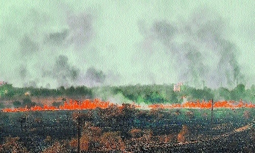 Like every summer, this year also, a fire broke out in Ambazari Biodiversity Park in about 10 hectares of area, gutting precious trees and grass on Tuesday afternoon. With the start of summer season, fire-related incidents become a common event every year in the Park as it shares boundaries with human settlements and commercial infrastructure from all sides. This time, the Forest Department believes that the fire broke out due to a spark in high-tension line that crosses through the Park. “Human error may be also a reason for this fire as it started near a sewage treatment plant (STP) situated near the Park,” Dr Bharat Singh Hada, Deputy Conservator of Forest told ‘The Hitavada’. “We conduct extensive fire monitoring during summers in the Park. There are 12 watch towers in the Park and every tower has CCTVs to monitor fire or smoke-related incidents,” said Dr Hada. “On Tuesday, one of our staff members noticed smoke emanating from near the STP. He immediately informed the Range Forest Officer (RFO) about the incident.