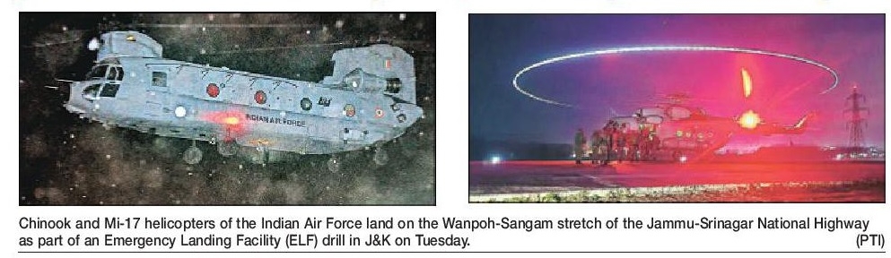 FIVE IAF helicopters, including the recently inducted US-manufactured Chinook, landed on a stretch of the Jammu-Srinagar National Highway as part of an Emergency Landing Facility drill, the first such exercise in J&K, officials said on Tuesday. With this, J&K became the first UT to operationalise an Emergency Landing Facility (ELF). Andhra Pradesh, Uttar Pradesh and Rajasthan are the three States where these emergency landing strips are currently operational.