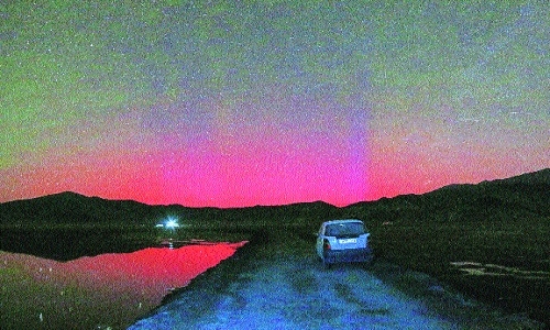 A CRIMSON glow lit up the dark sky in parts of Ladakh in a rare stable auroral red arc event at the Hanle Dark Sky Reserve in the high Himalayas due to the strong solar magnetic storms launched towards Earth. The solar storms or coronal mass ejections are from the AR13664 region of the sun that has produced several high energy solar flares, some of which are travelling towards Earth at a speed of 800 km/s, scientists at the Centre of Excellence in Space Sciences in India (CESSI), Kolkata, said. Spectacular auroras or northern lights lit up the skies in the higher latitudes of the northern hemisphere as skywatchers from Austria, Germany, Slovakia, Switzerland, Denmark and Poland shared pictures and short videos of the dancing lights on social media. In Ladakh, astronomers at the Hanle Dark Sky Reserve saw a red glow on the northwest horizon in the sky from about 1 am on Saturday that continued till early dawn. “We were fortunate to witness Aurora activities on our all-sky camera during regular telescope observations,” Stanzin Norla, an engineer at the Hanle Dark Sky Reserve, told PTI. He said a faint red glow was visible to the naked eye along the horizon and the event was captured in much detail by a DSLR camera installed at the Hanle Dark Sky Reserve.