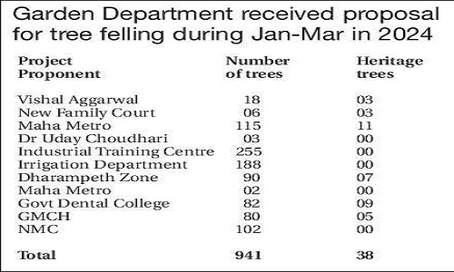 In the name of infrastructure development across city, project proponents approached the Garden Department of Nagpur Municipal Corporation (NMC) for approval to fell more than 941 trees in the first quarter of this year, revealed a data provided by a group of citizens and environment activists on Wednesday. The data is compiled by the group on the basis of notices published by the Garden Department in local newspapers between January and March 2024. According to the data, 11 project proponents, including government and private both, sought permission of the Garden Department to fell at least 941 trees, including 38 heritage trees, for various construction works during the period. Industrial Training Centre, Nagpur, asked the Garden Department’s permission to fell a staggering 255 trees for the construction of a branch of Aeronautical Structure Equipment Fitter Building.