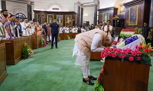 PRIME Minister Narendra Modi on Friday expressed his unwavering dedication to the principles enshrined in the Constitution, which, he said gives crores of people hope, strength, and dignity. Modi, who has often spoken about his humble beginnings, took to X to emphasize the transformative power of the Constitution. “Every moment of my life is dedicated to upholding the noble values enshrined in the Constitution of India given to us by Dr Babasaheb Ambedkar,” he said in a post on the mincroblogging site and shared a photo of him bowing to the Constitution in a meeting in Parliament with his allies.
