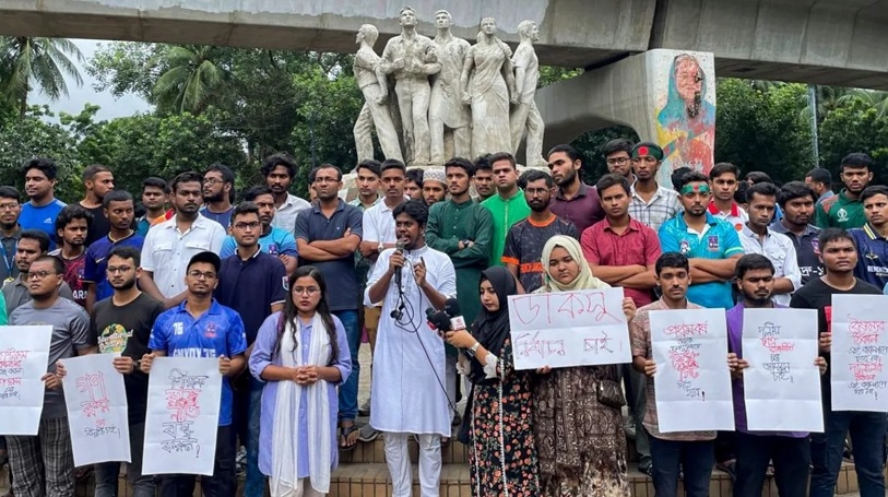Students of Dhaka University protest at Raju Memorial site opposite Teacher Student Centre (TSC), demanding no political interference in academic campuses and early conduct of students’ union elections at the varsity.