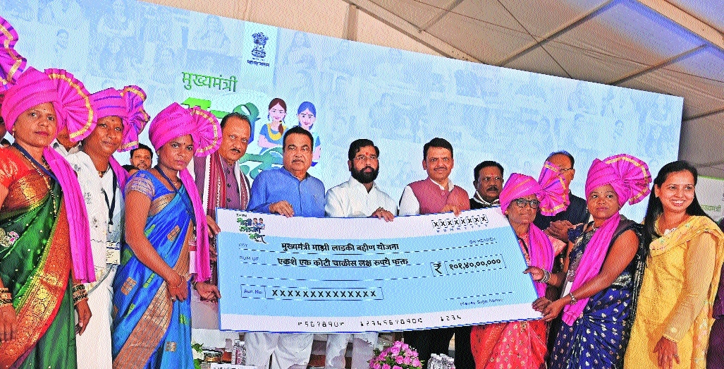 Chief Minister Eknath Shinde, Deputy Chief Ministers Devendra Fadnavis, Ajit Pawar, Union Minister Nitin Gadkari, Aditi Tatkare and beneficiaries holding cheque of the amount deposited in women’s account.