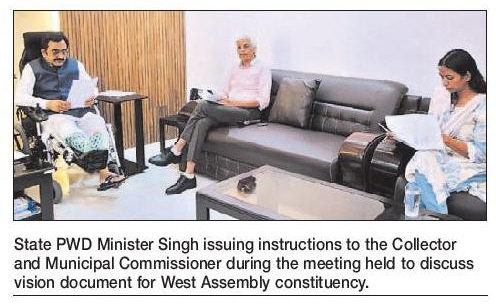 STATE Public Works Department Minister Rakesh Singh convened a meeting on Monday to discuss the vision document for West Assembly constituency. Collector Deepak Saxena, Municipal Commissioner Preeti Yadav and other officials concerned were present on the occasion. During the meeting, Singh had detailed discussion on the key issues, needs and priorities of the West Assembly area. He issued instructions regarding utilisation of BSNL’s P&T factory land at Ranital for public welfare and directed the Collector to issue a notice to the concerned party. Singh stated that the land was originally allocated to provide communication services to the city and its purpose remains in public interest. If the original purpose has been fulfilled, the land should still be used for the city’s priorities and public needs, in accordance with the law. The PWD Minister also addressed the need to beautify and renovate Gwarighat cremation and asked officials to carry out repair and beautification work. He proposed a budget of Rs 3.15 crore for the works, which would be raised through public contributions.