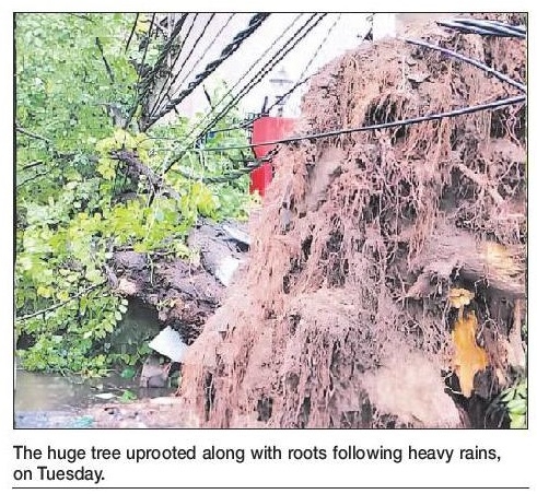 A MAJOR accident was averted in the city on Tuesday when a huge lush green tree suddenly fell onto the road, creating chaos at the site. The incident took place near Income Tax Square, where the tree fell and severely damaged two cars. Fortunately, several people narrowly escaped otherwise it could have been a fatal accident. After the tree fell, area residents immediately informed the Jabalpur Municipal Corporation (JMC) and the Electricity Department. Later, teams arrived on the scene and began the process of clearing the tree from the road. Eyewitnesses stated that if people standing under the tree had not moved in time, their lives could have been in danger. It is alleged that the tree was many years old and the cementing around its base may have contributed to its collapse. A large crowd gathered at the site following the incident. Area people informed that at around 1.45 pm on Tuesday, they heard a loud noise. Many people thought it was thunder. But when they looked, people saw that a massive tree had fallen on top of an electric pole and two cars.