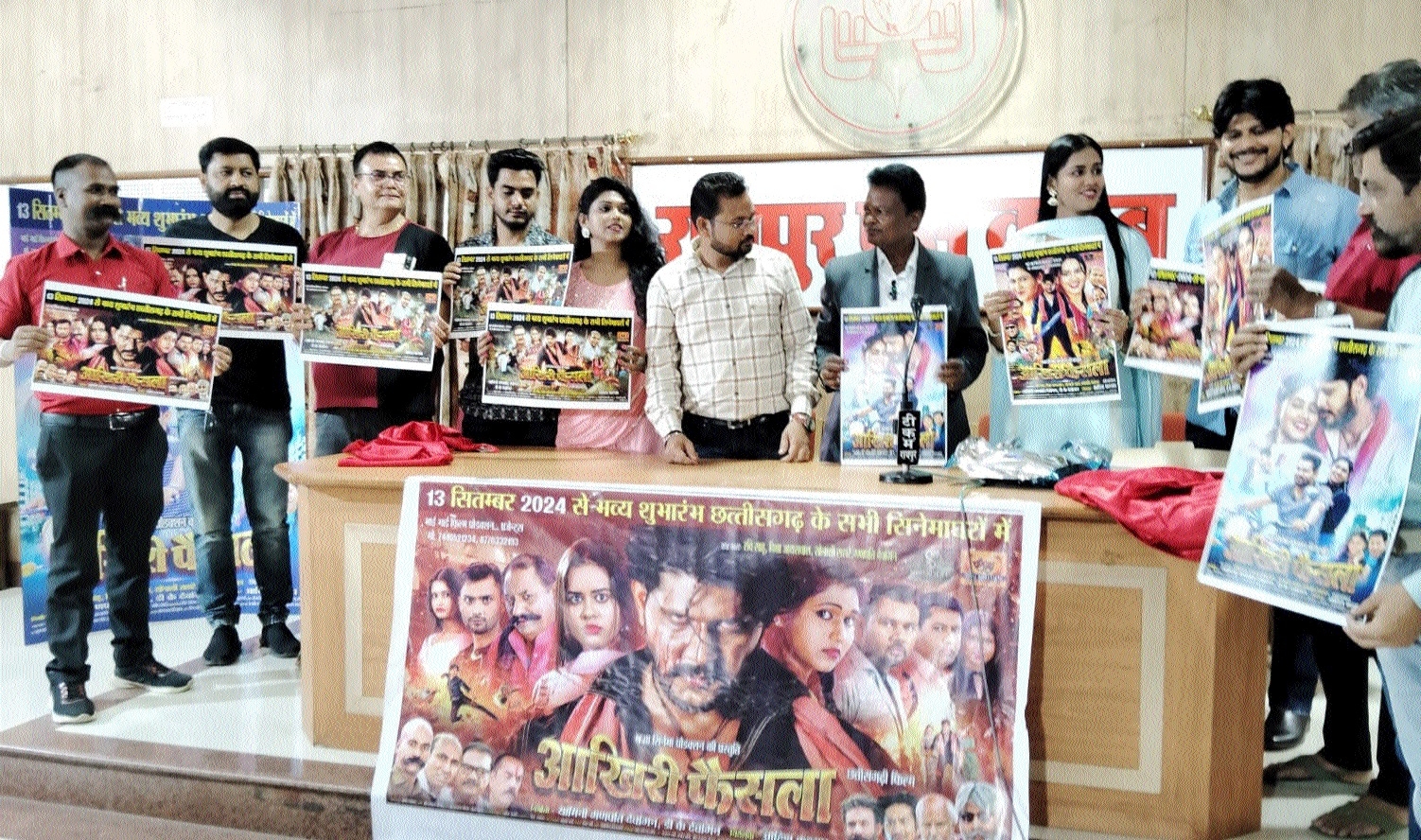 The multi starrer Chhattisgarhi film Aakhri Faisla, directed by Adish Kashyap, made under the banner of Bhai Bhai Film Production and Shraddha Cinema Production will be released on September 13. The Producer of this film, Yamini Ganpati Dewangan informed the media during a press meet and poster launch of the film at Raipur Press Club, recently.