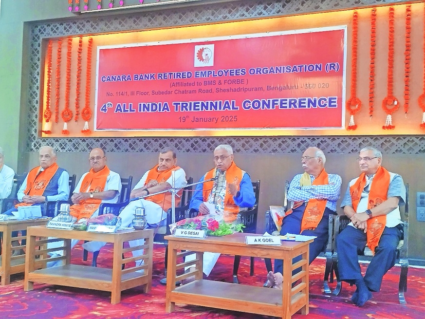 The Conference Chairman and National President of Canara Bank Retired Employees Organisation Anil Goyal, National General Secretary of Bharatiya Mazdoor Sangh Ravindra Himte, National General Secretary of Varishth Nagrik Sangh Vasantrao Pimplapure, National President of Forum of Retired Bank Employees V G Desai, National General Secretary C N Bargaje, National General Secretary of Canara Bank Retired Employees Organisation R R Kulkarni were seated on the dais.