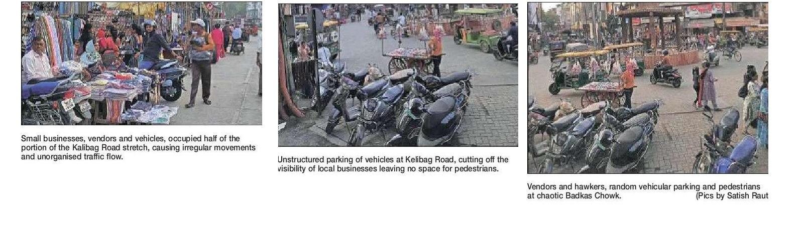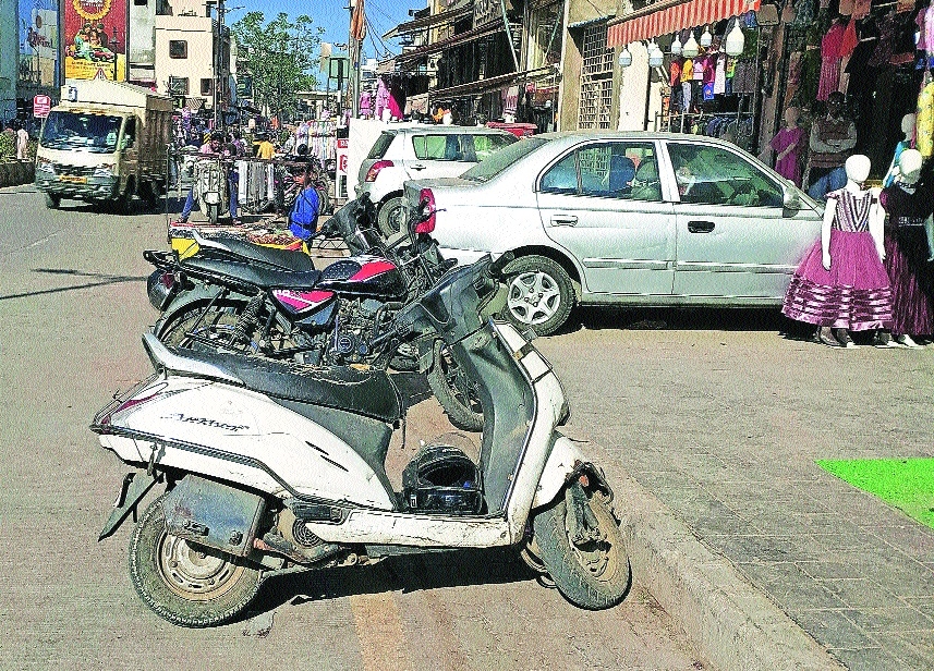 While hawkers dominate the newly-widened Kelibag Road, the shopkeepers occupy the footpath by not only putting up the shop display but also park their four-wheelers. (Pic by Satish Raut)