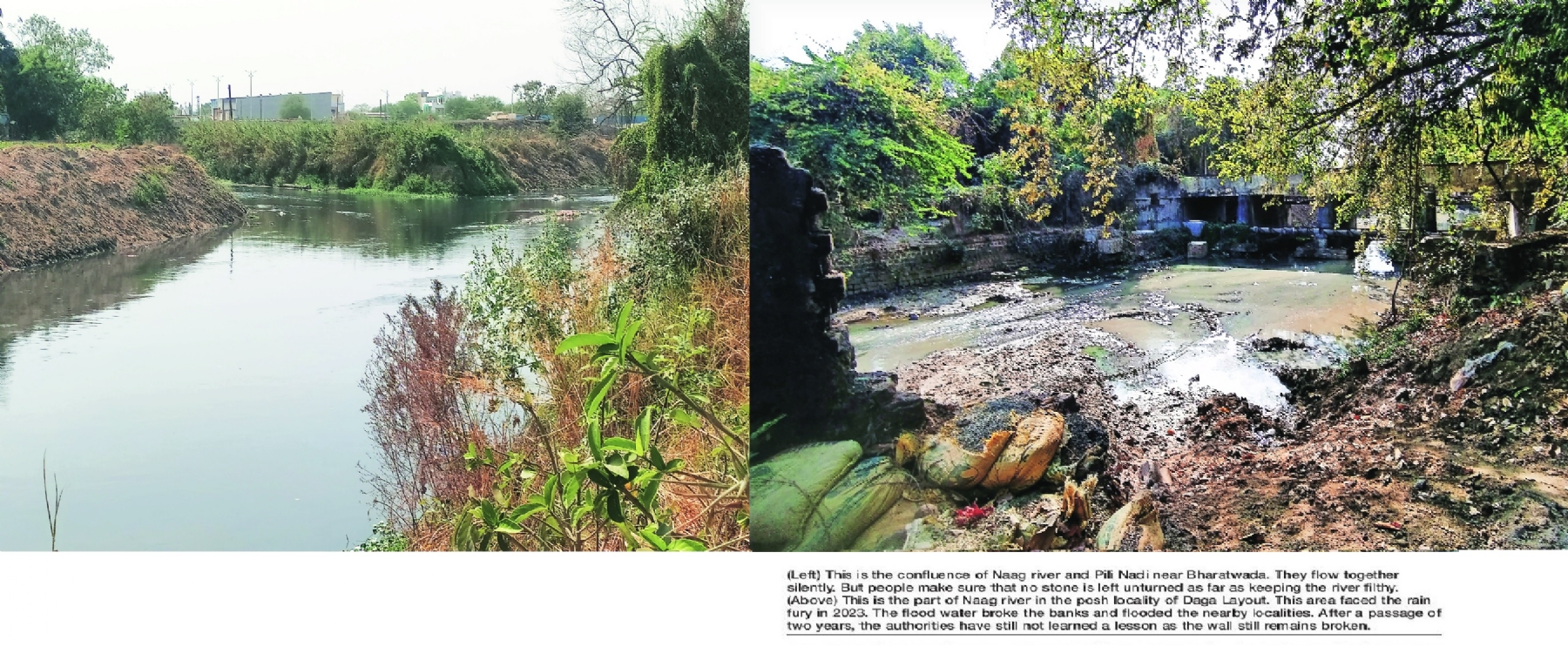 Dirt and garbage still blemishes the banks of Naag river. Pili Nadi joins Naag river near Bharatwada and both flow silently without anybody caring for them. The garbage, left-over food material, sewage water etc is being released by the citizens of Nagpur and it has become the norm.