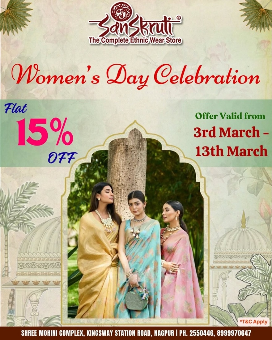 To mark the occasion of International Women’s Day, Sanskruti Sarees has started a special offer of flat 15 per cent discount on everything including the new wedding and summer collection of exclusive Sarees, suit sets, salwar suits, lehengas and men’s wear. The offer is valid only till March 15. New stock of latest collection has arrived at Central India’s ethnic clothing pride. One of the most reputed and trusted showrooms in Central India, Sanskruti remains the most preferred shopping destination of people from Nagpur and surrounding areas. Exclusive collection of pure silk, Paithani, Kangipuram, Chanderis, Patola, Kota Doria, Bandhni, pure Banarasi silk sarees and designer sarees with embellished embroidery is available at the stores.